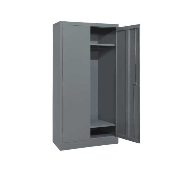 Standard compartmentalized steel wardrobe cabinet for clothes, shoes, and other items.